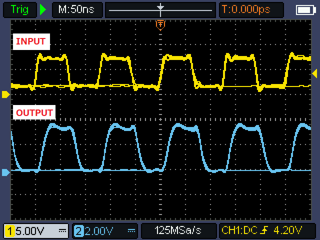 SPI信号の電圧レベルシフトに使用した74HC4050APが正しく動作しているか、クロック信号の入出力電圧波形を確認してみました。