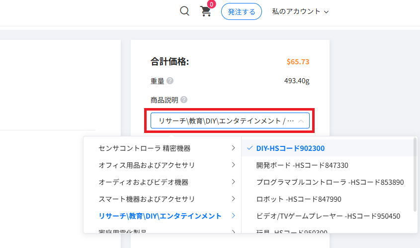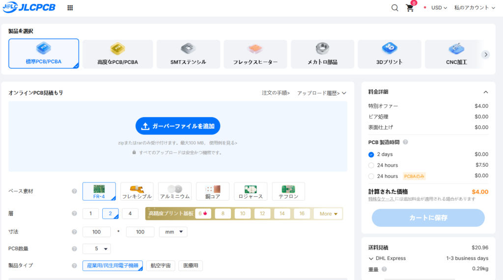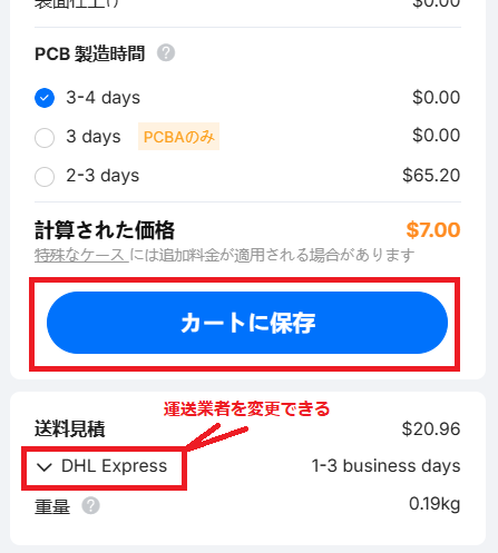 基板のみの発注であれば、ここで画面右側の「カートに保存」ボタンをクリックすればOKです。その際、ボタン下の運送費の見積もり額を確認しておいても良いでしょう。なお、発注時に変更できますので間違えていても気にする必要はありません。