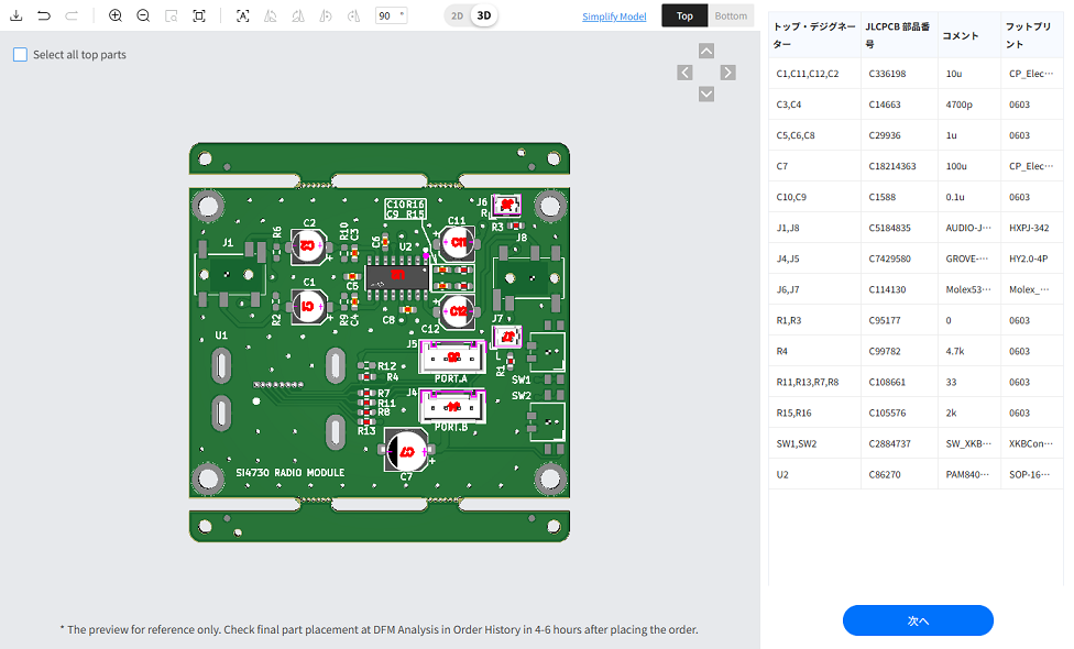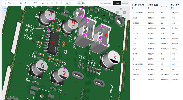 3D表示で見れるのでグリグリ回してみると面白いですね。私の知る限りですが、現時点でこのような部品配置図を基板発注前に確認することができるシステムは、JLCPCBさんオリジナルとなっています。