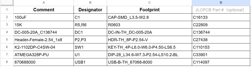 なお、BOMファイルとは”Bill of Materials”の略語で、BOMリストや部品リスト、部品表とも呼び、基板に実装する部品一覧表になり、以下のような部品名称、リファレンス番号などが記載されたファイルです。