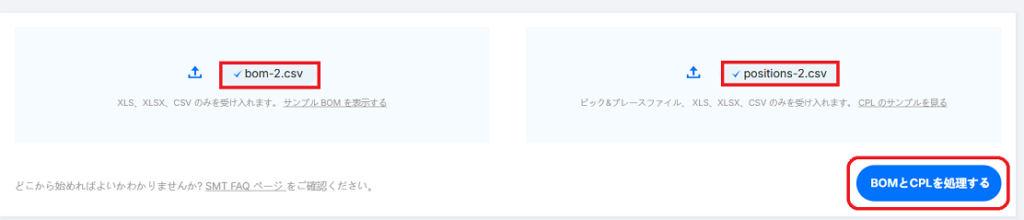 - アップロードが終わりましたら、右下の「BOMとCPLを処理する」をクリックします。