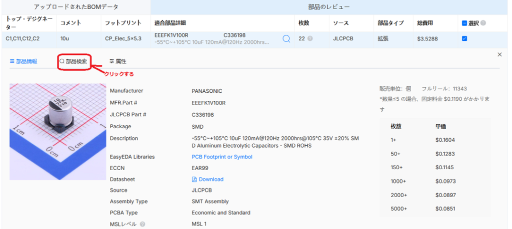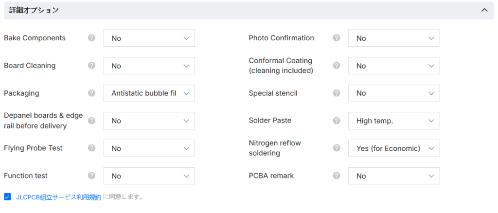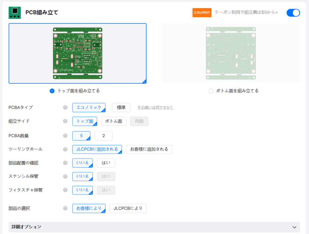 ここで、PCBAタイプが「標準」のみで使える部品があるので、エコノミックを選択した場合は「エコノミック」でも使える部品となっているか注意しておくと良いです。ここで「標準」のみの部品を選択した場合は、PCBAタイプが「標準」の製造仕様に変更され価格がアップします。