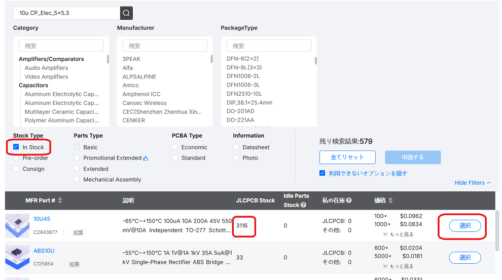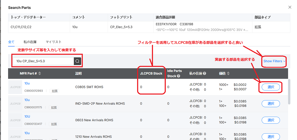 - メーカの部品番号や部品名称、抵抗値や容量など部品定数、部品サイズ、あるいはLCSC部品番号などを入力して検索します。この時、JLCPCBにStockがある部品でフィルターをかけてから検索すると良いです。