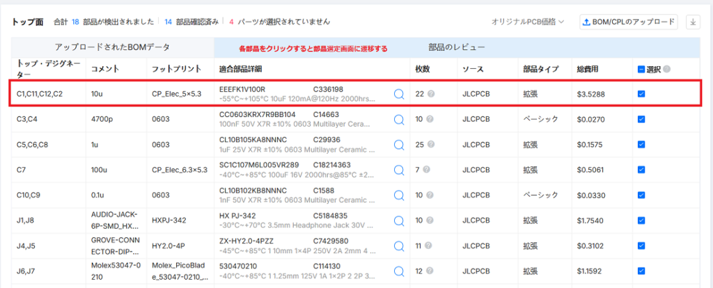 次に読み込んだBOMファイルから部品を設定する画面に遷移します。今回製作した基板のBOMファイルには、JLCPCBパーツ番号と同じ意味となるLCSCパーツ番号を記載しているため画面上にすべての部品が表示されましたが、JLCPCBパーツ番号をBOMファイルに記載していない場合は、各部品番号(Designater)に対して部品を選定していく作業になります。