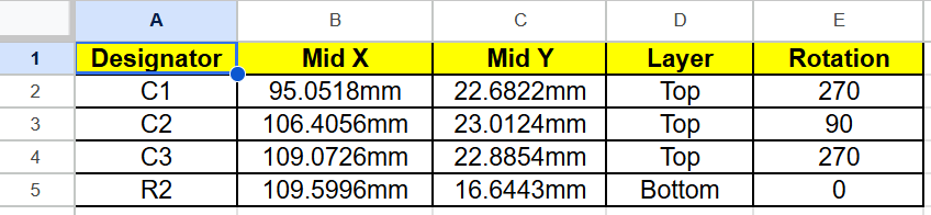CPLファイルとは”Component Placement List”の略語で、部品の実装位置を指示する部品配置座標図になり、以下のようなX,Y座標、実装角度、配置面といった情報が記載されたファイルです。
