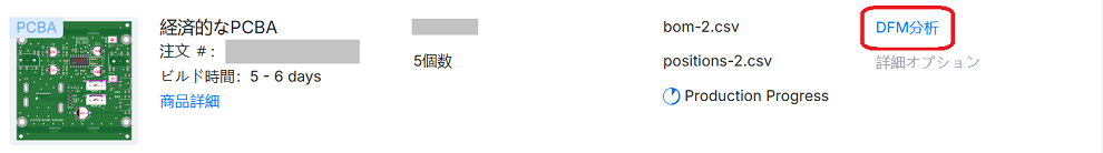 発注履歴から該当する基板組み立ての行を見つけます。右側の操作方法の列に”DFM分析”が選択できることがわかります。