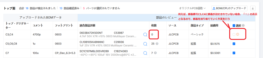 なお、部品番号(リファレンス番号、Designater:デザインエイター)に部品が選定されていない場合は、「選択」部分にチェックマークが表示されておらず、「!」マークになっています。