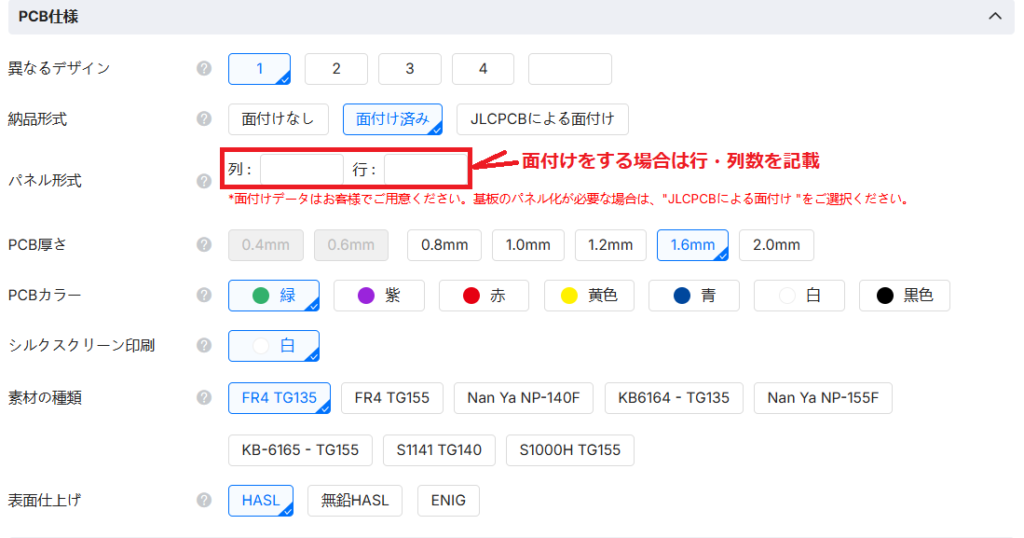 PCB数量については、後述する納入形式をパネル形式で発注する場合は、パネル数量となりますのでご注意ください。