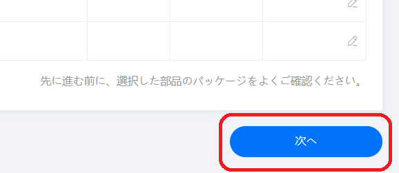 - すべての実装部品が選定できましたら「次へ」をクリックします。