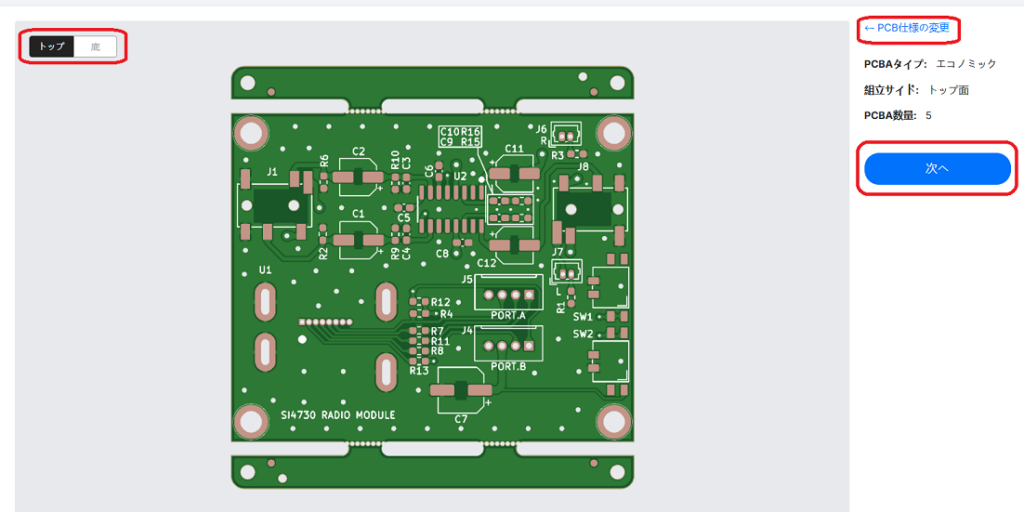 まず基板図面が大きく表示されます。画面左側のボタン「トップ/底」で表面、裏面ともに問題が無いか確認しましょう。設定済の基板仕様やPCBA仕様を再確認・修正したい場合や、ガーバーファイルを変更したい場合は画面右側の「←PCB仕様の変更」をクリックすると、基板製造資料の設定をやり直すことができます。