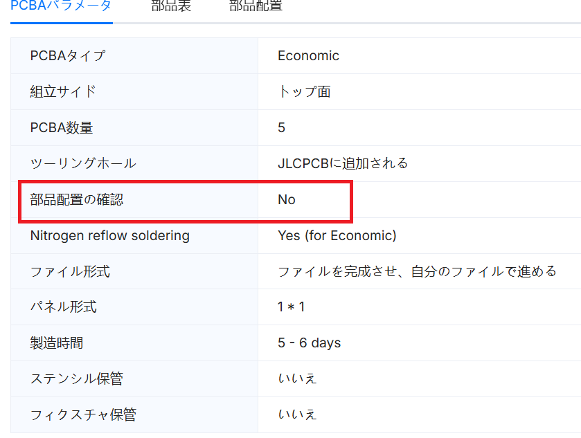しかも、今回の基板組み立て仕様では、部品配置の確認を”No”に設定してしまっています。これは完全に失敗したのでしょうか?それとも無事にJLCPCBさんのエンジニアリング力で正しく修正実装してもらえるのでしょうか?