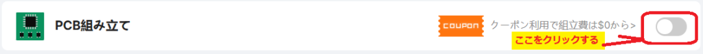 PCBアッセンブリを依頼する場合は上記の基板製造に必要な作業の後に「PCB組み立て」のボタンをオンにします。