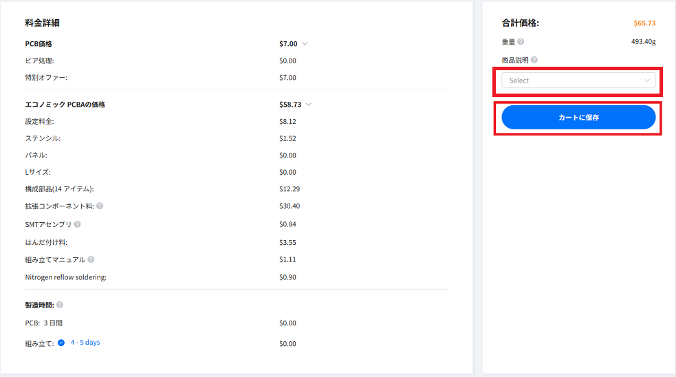 次の画面で下図のような金額見積もりが表示されますので確認し、今回発注する基板に適した商品説明を選択し「カートに保存」をクリックします。