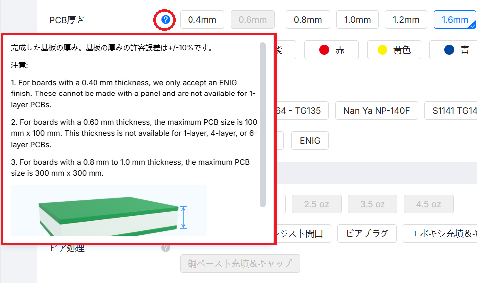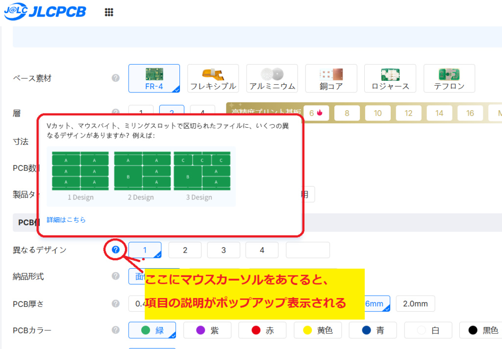 基板仕様の決定にあたって基本的には各項目についてWEB画面上に表示されている選択肢から回答を選べばよく、また、各項目にある「?」マークににマウスカーソルをあてると日本語で項目の意味をポップアップ表示する機能もあり親切なWEBサイト設計となっています。