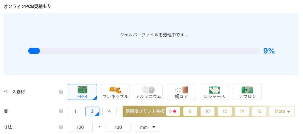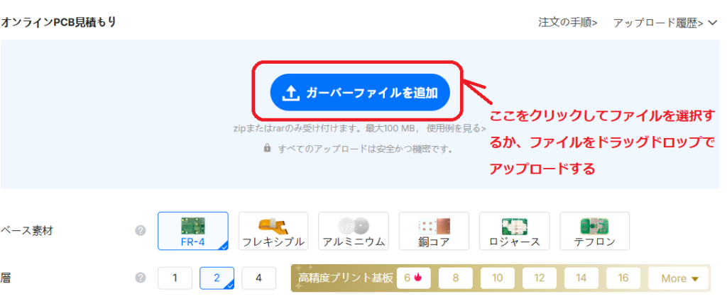 「ガーバーファイルを追加」をクリックしてアップロードするガーバーファイルを選択します。あるいはファイルを「ガーバーファイルを追加」の部分にエクスプローラーからガーバーファイルをドラッグドロップしてもアップロード可能です。