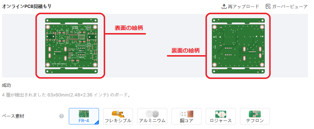 じっと待っていると無事にアップロードが成功して基板図が表示されます。もし失敗する場合は、再アップロードを試してみて下さい。JLCPCBさんのサーバ側の制約のためなのか、ガーバーデータのサイズが大きいのか、アップロードが失敗したり時間がかかることもあります。