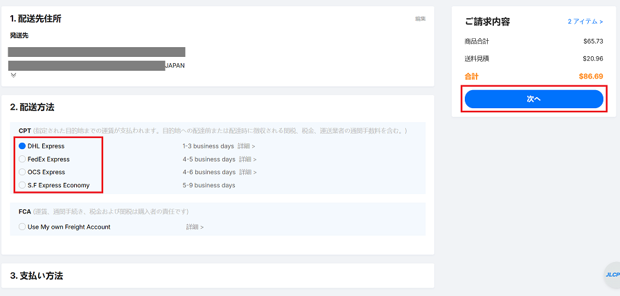 DHLやFEDEXを利用、急ぎでないものはOCSを利用するのが安価で良いと思います。決まりましたら「次へ」をクリックします。