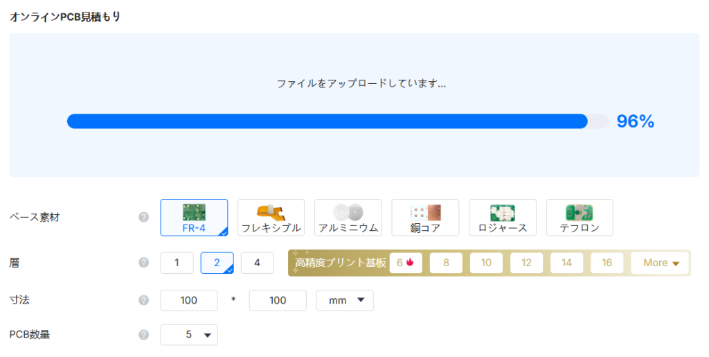 JLCPCBさんの場合、基板サイズが100㎜×100㎜以下、両面基板で5枚製造の場合は、2USDからとなっており格安です。おそらくフライングチェッカーや基板洗浄が無しといったように最低限必要な工数に絞り込んだ基板製造なのだと思われますが、この価格は他の業者さんでは見たことないです。ただし、原材料費の高騰が叫ばれる昨今、残念ながらこの価格がいつまでも続くかどうかはわかりません。学生や個人クリエイターのためにいつまでも価格面で頑張って頂きたいですね。