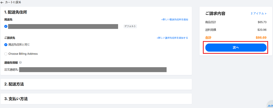 次の画面で配送先と請求先の住所の入力進めます。過去に一度でも利用していれば住所はデフォルトとして表示されます。確認後「次へ」をクリックします。