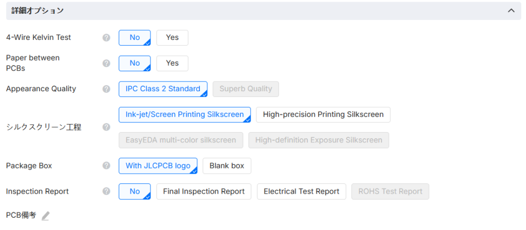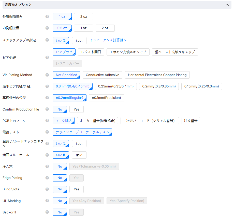 いずれの設定も価格に反映されるので、基板設計はデフォルト設定で必要十分となる設計にしておくことが好ましいです。