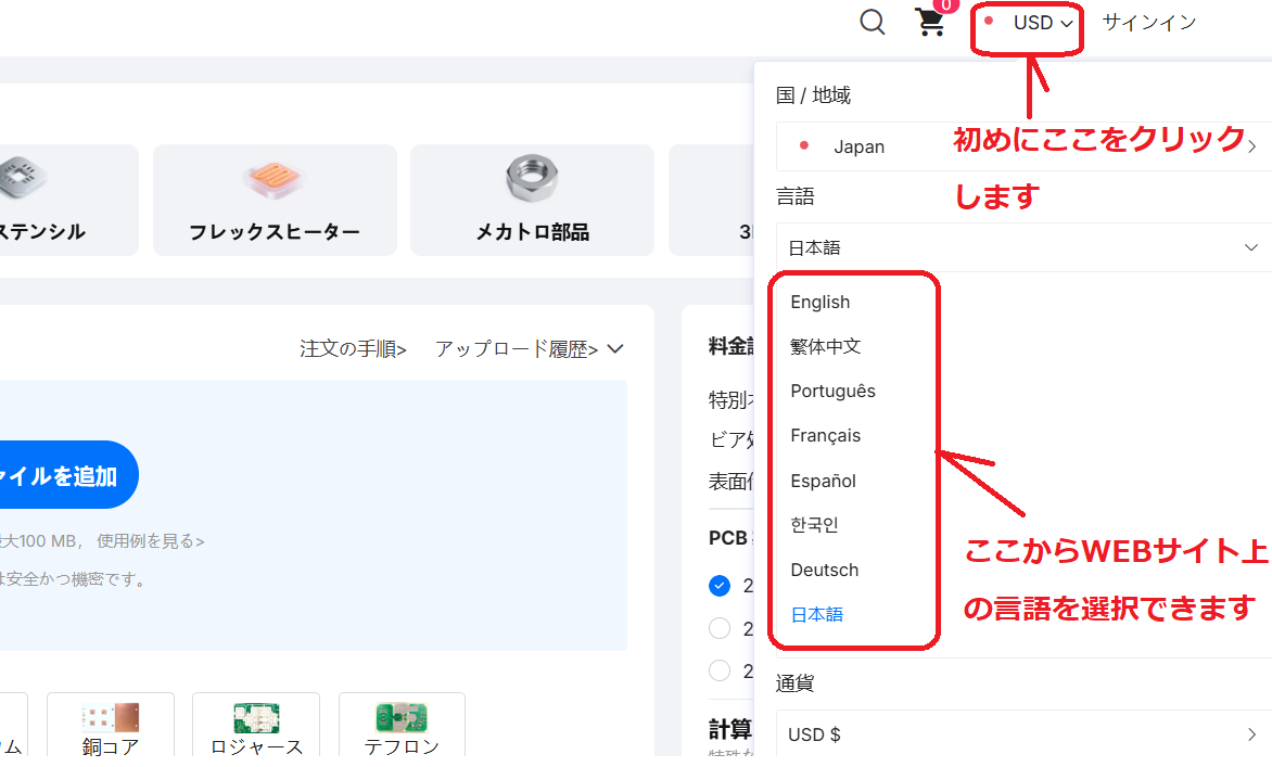 JLCPCBさんの基板製造サイトは中国語はもちろんのこと英語やドイツ語など、本記事の執筆時点においては8つの言語に対応されており、日本語での表示も可能なので英語が苦手な方でも分かり易くなっています。