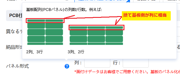 基板をいくつか並べて一枚の基板にすることを「面付け」と言いますが、面付けする場合はパネルの列と行を入力します。ここで、JLCPCBさんでは、捨て基板(edge rail)のある側が列を意味しています。ただし、自身で用意したガーバーデータと入力した行と列の数字が間違えていても修正されるのであまり神経質になる必要はないです。