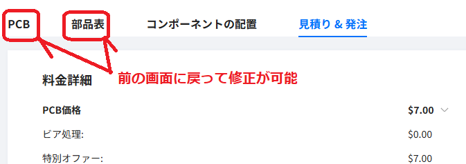 この画面までは、上部のメニューから基板仕様や、BOMリスト、CPLリストの修正が可能です。