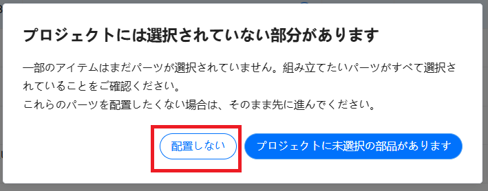 - BOMファイルに記載があるにもかかわらず未配置部品がある場合は、注意メッセージが表示されます。未配置で問題無ければ、「配置しない」をクリックします。やり直す場合は、「プロジェクトに未選択の部品があります」をクリックします。