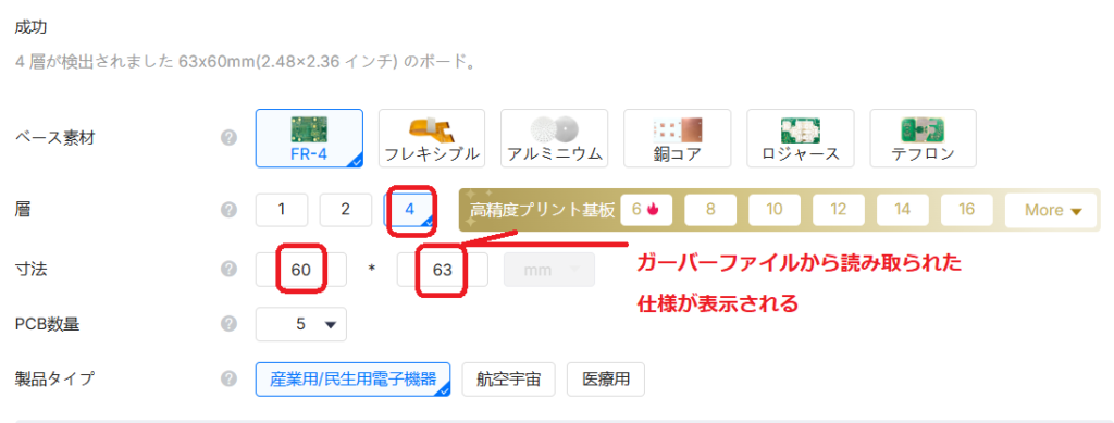 ベース素材以下、製品タイプまでの項目は特に難しい点は無く理解できる内容と思います。層数と寸法はガーバーデータから読み取られた数字があらかじめ記載されていますが念のため確認しましょう。