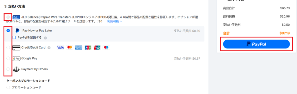PayPalやクレジットカードなど支払い方法を選択し、画面右側の支払い用の「PayPal」や「支払う」のボタンをクリックすれば発注が完了します。