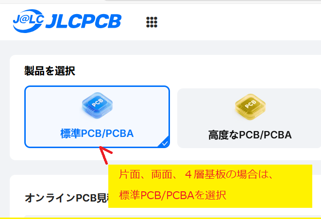 はじめに製造する基板の種類を選択します。例えば、FR-4プリント基板であれば標準PCB/PCBAを選択します。
