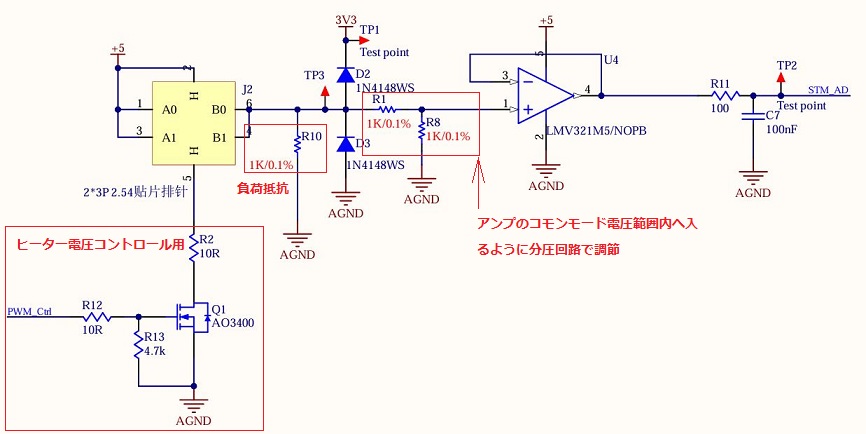 、WinsenのMQシリーズのデータシートに記載の負荷抵抗は4.7KΩが例として使われていましたが、このモジュールでは、負荷抵抗R10は1KΩを選定しているようです。この後は抵抗分圧で後段のバッファ回路(ボルテージフォロワ)の入力電圧範囲に入るように設計されています。ここで、R1,R8も負荷抵抗と考えられると思うのですが、そうすると、R10は必要なのか?と言いう疑問が湧きます。