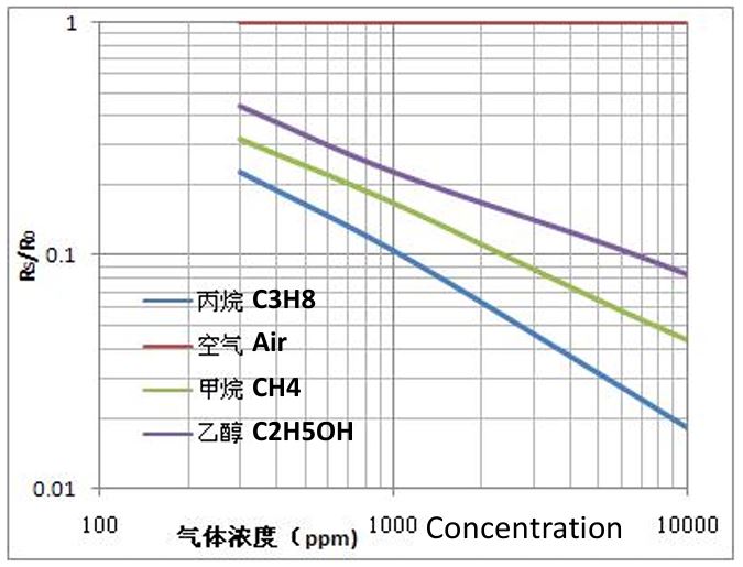 - ブタン、プロパン、メタンに対して高い感度を持ち、メタンとプロパンを同時に検出できます。さまざまな可燃性ガス、特に LPG (プロパン) を検出できます。