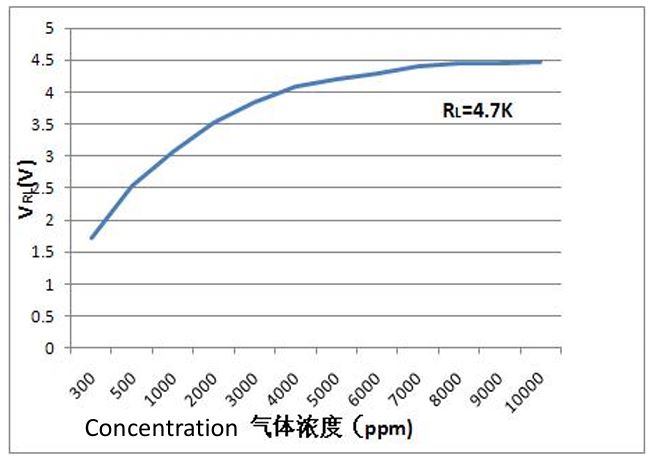 - ガス濃度は、VRLの電圧を測定しデータシートに記載のRL=4.7KΩの場合のグラフから推定濃度として読み取る必要があります。