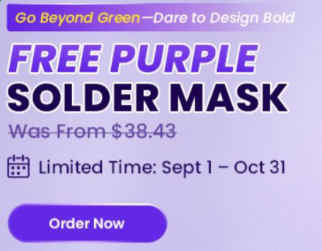 ところで、今回の基板作成依頼時にはパープル色のレジストがなんと無償で利用できるとのことでしたので、お言葉に甘えてパープルにしました。しばしば、このようなサービスがあるので見逃せないです。基板の設計が完了する前にはPCBWayさんのWEBサイトをチェックすると良いことがあるかもしれません。